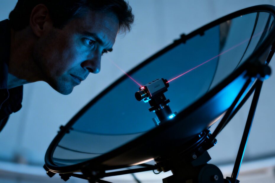Guia prático para usar um laser no centro de espelhos parabólicos, com técnicas de alinhamento, segurança ocular e truques para astrônomo solo.